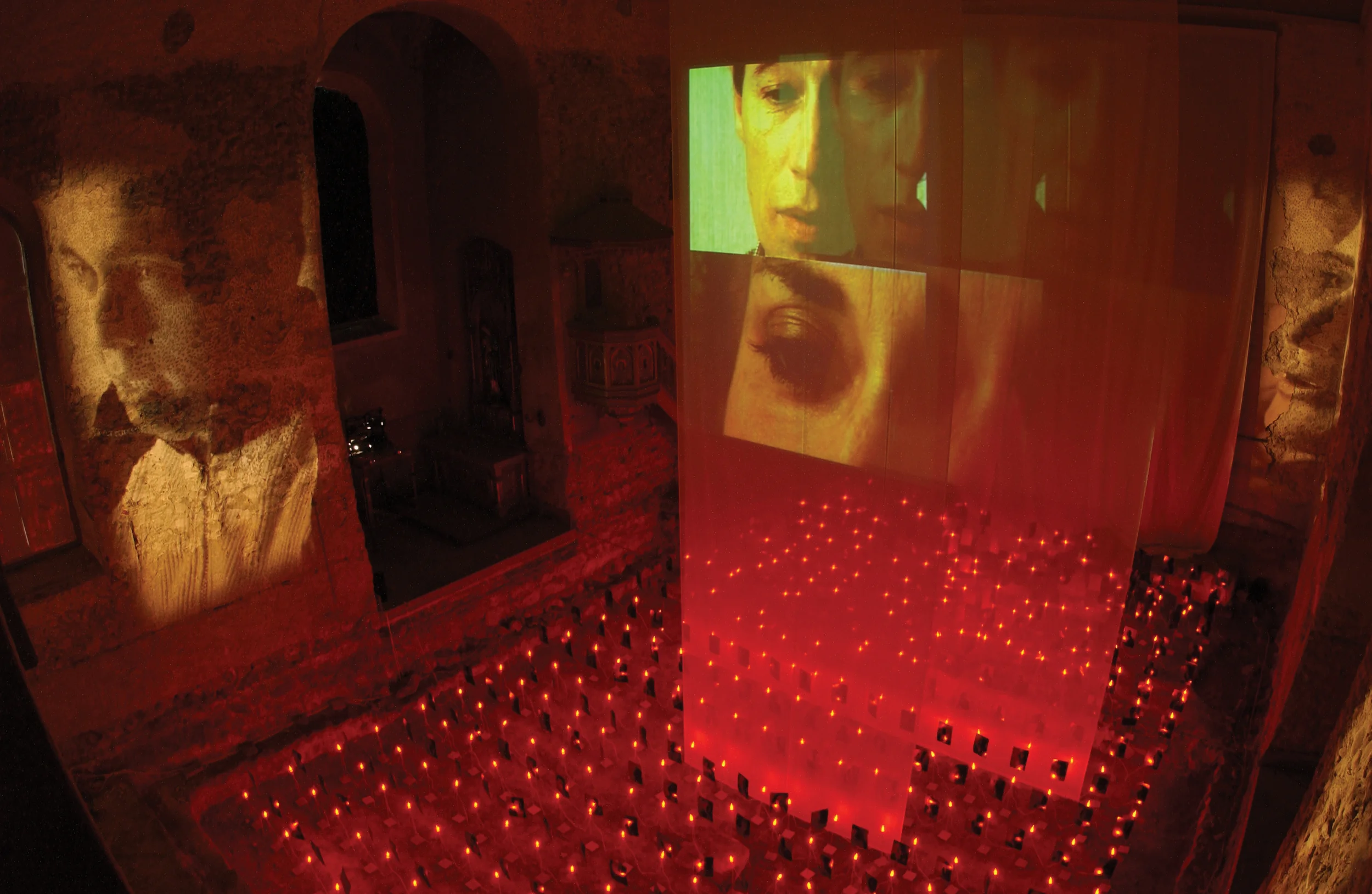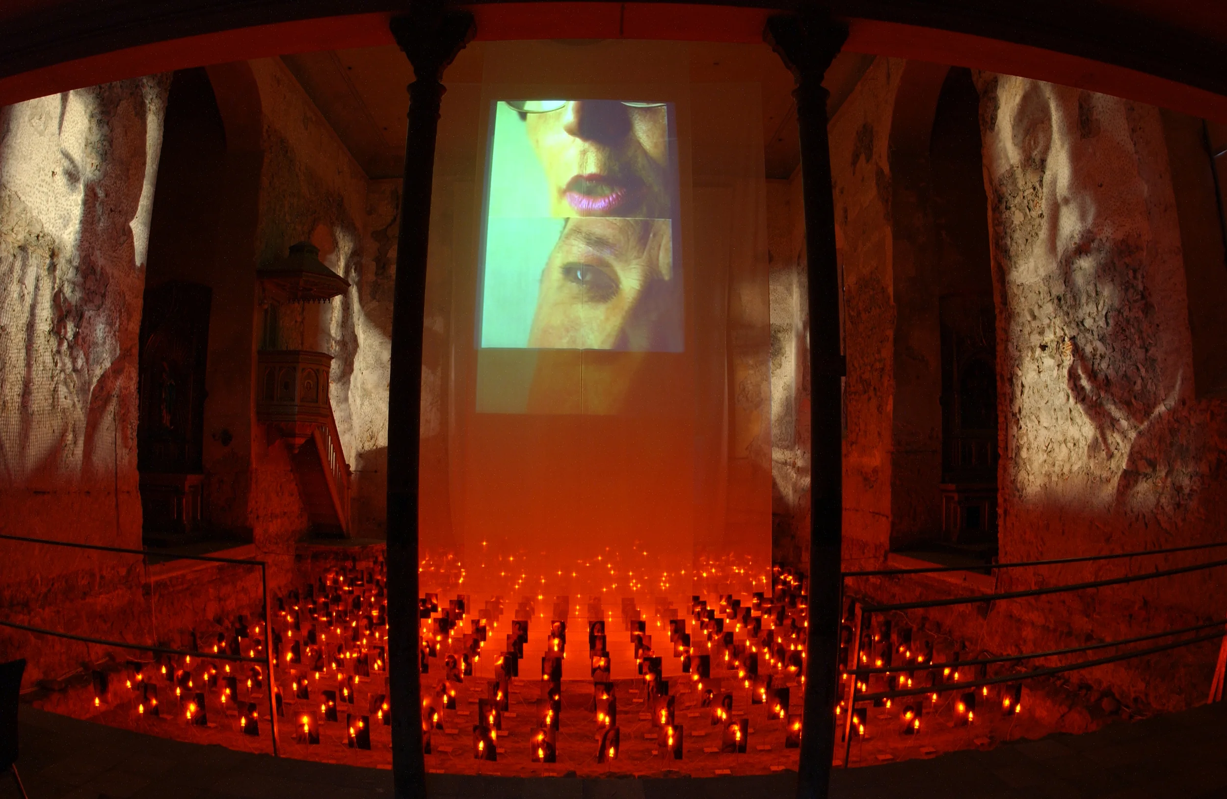 AMEN NEMMEN, multiple video, audio and slide projection, photography and light, site specific installation, the Johanniterkirche, Feldkirch, Austria, 2002. Curator: Eva Jakob