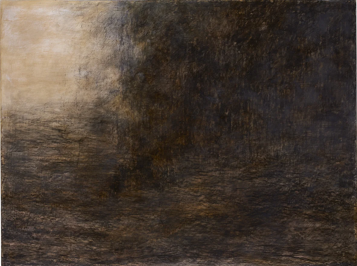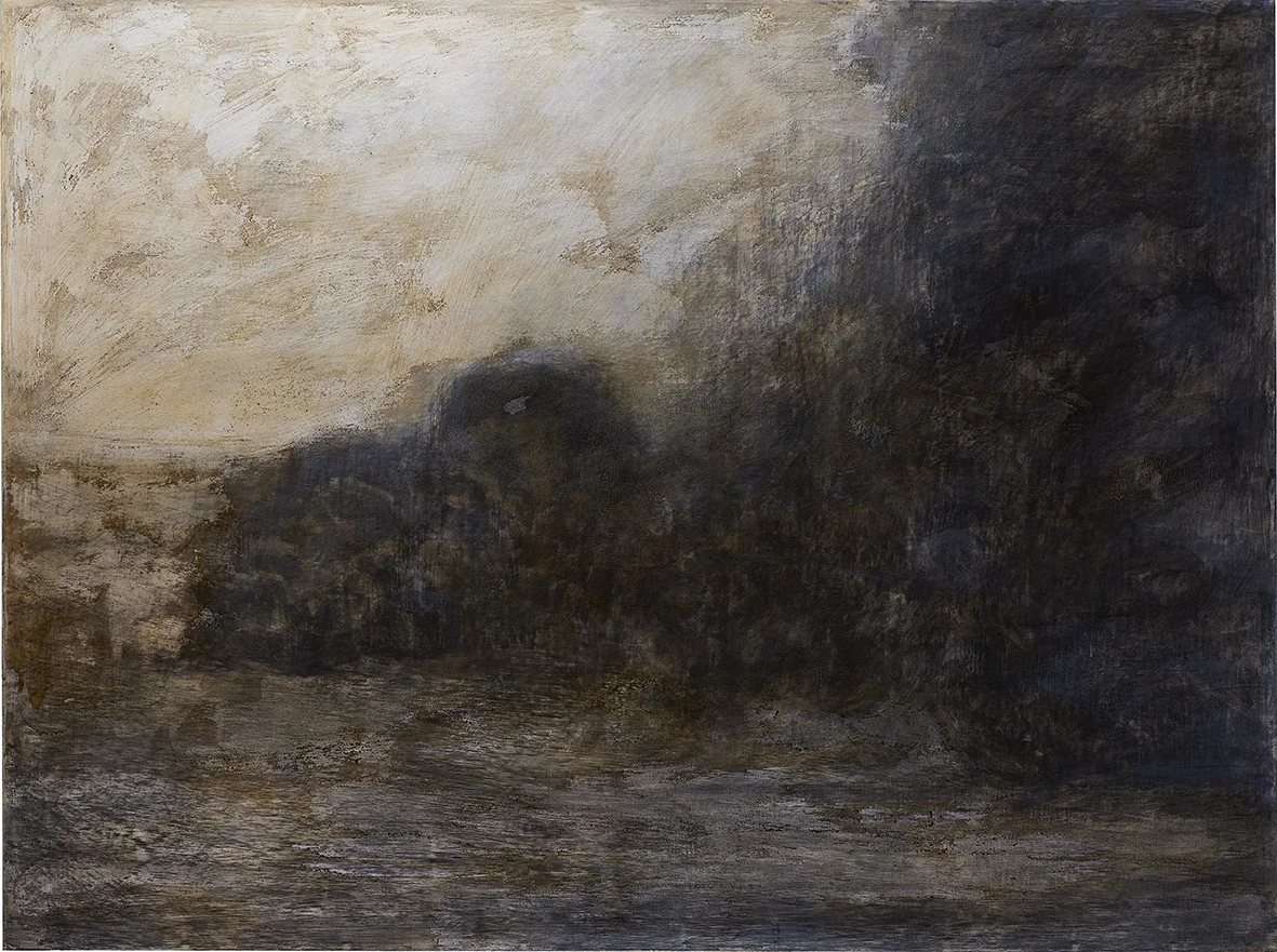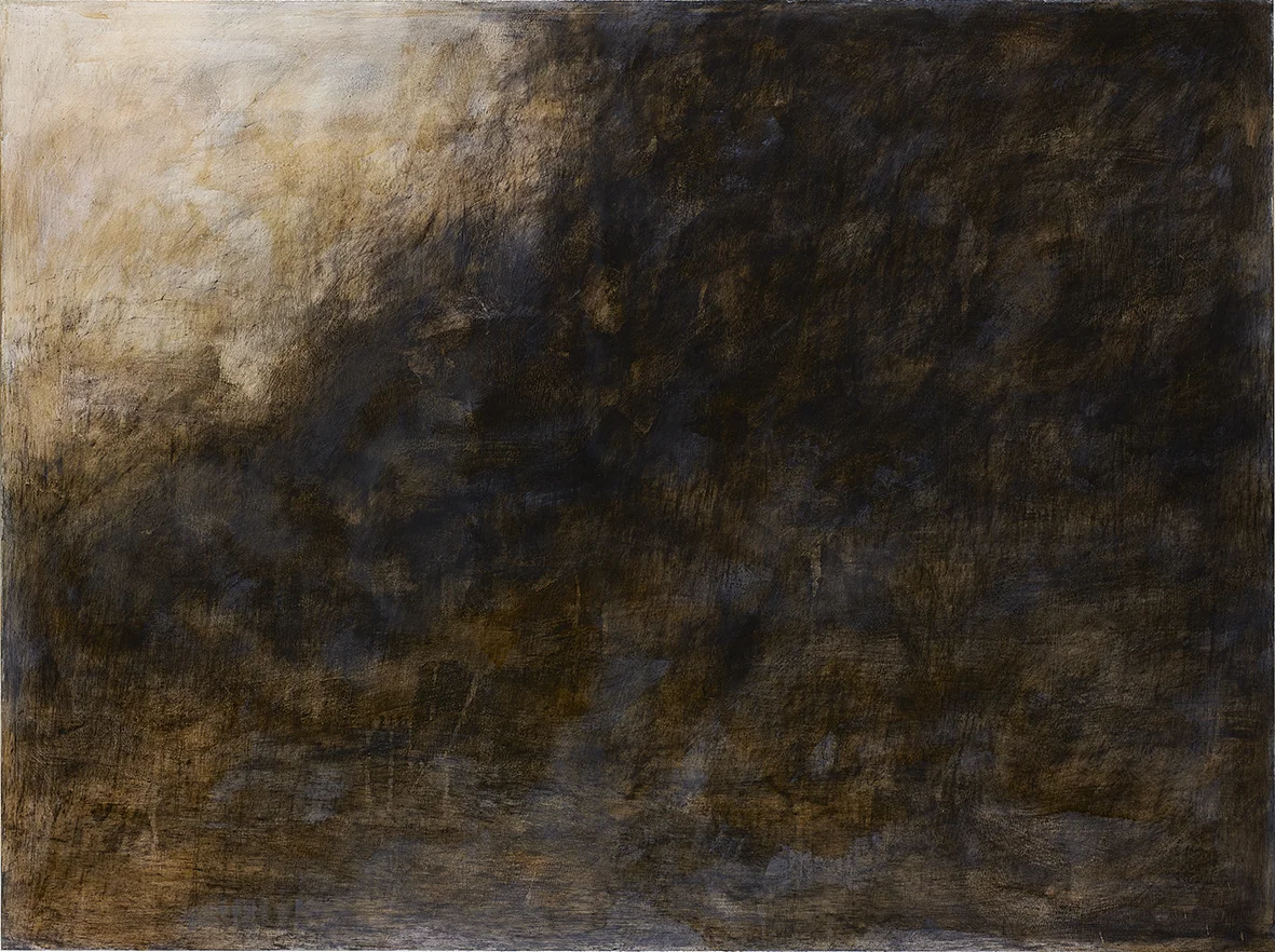 BETWEEN ASH AND DUST speak of implausible distances and detached spaces splitting up such evasive elements as smoke and sky. They are as much about the process of drawing/painting as they are about the current war imagery of destruction taken from tabloids or television. These metaphoric memorials sway unclearly between human intervention and natural phenomena and embody an act of restitution through the same material they are made of (charcoal being fire's residue), a destructive force embalmed through its very remains.