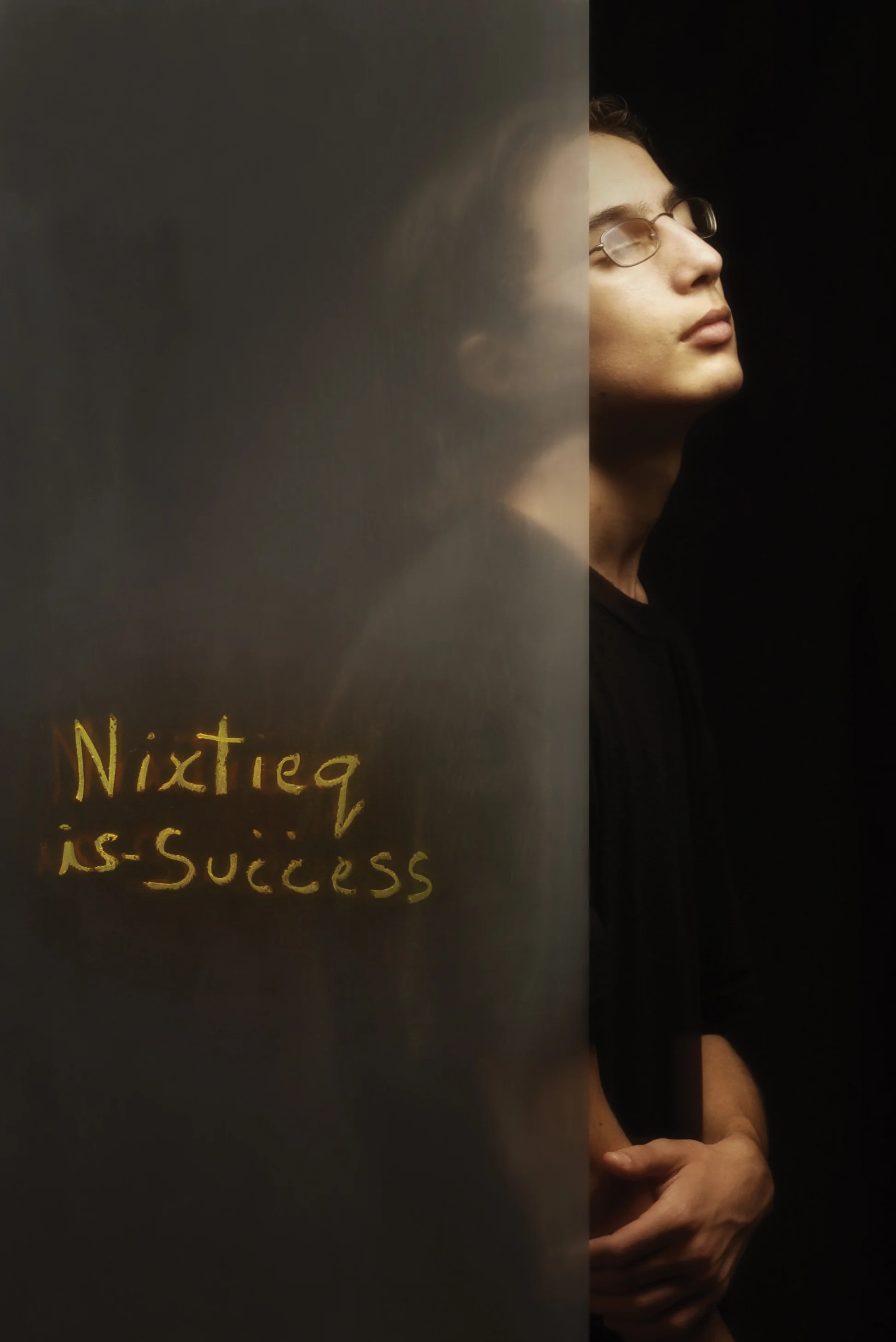 NIXTIEQ features a series of subjects responding to a given set of variables which I have defined, and thus sets out to document a direct experience of self-expression within a set of formal structures that tend to emphasise repetition and seriality. The work invites its participants to reflect on a deeply heartfelt wish and write it on a plate of glass, which will in turn be incorporated within a photographic portrait of the same participant.