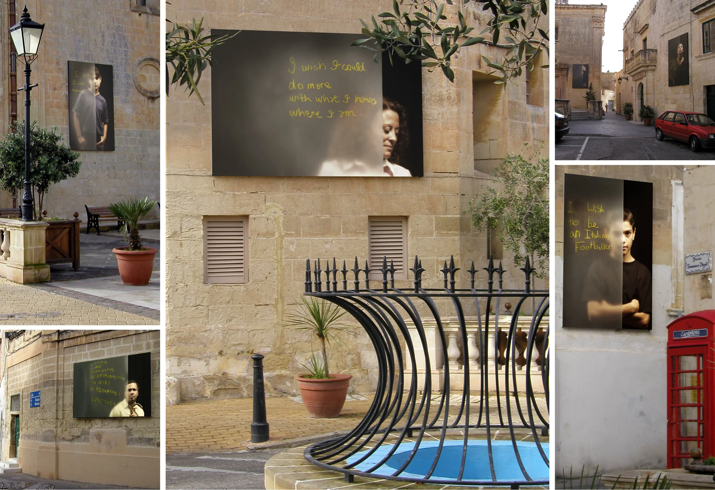 NIXTIEQ, inkjet prints on canvas, site specific installation, historic centre, Attard, Malta, 2002-3