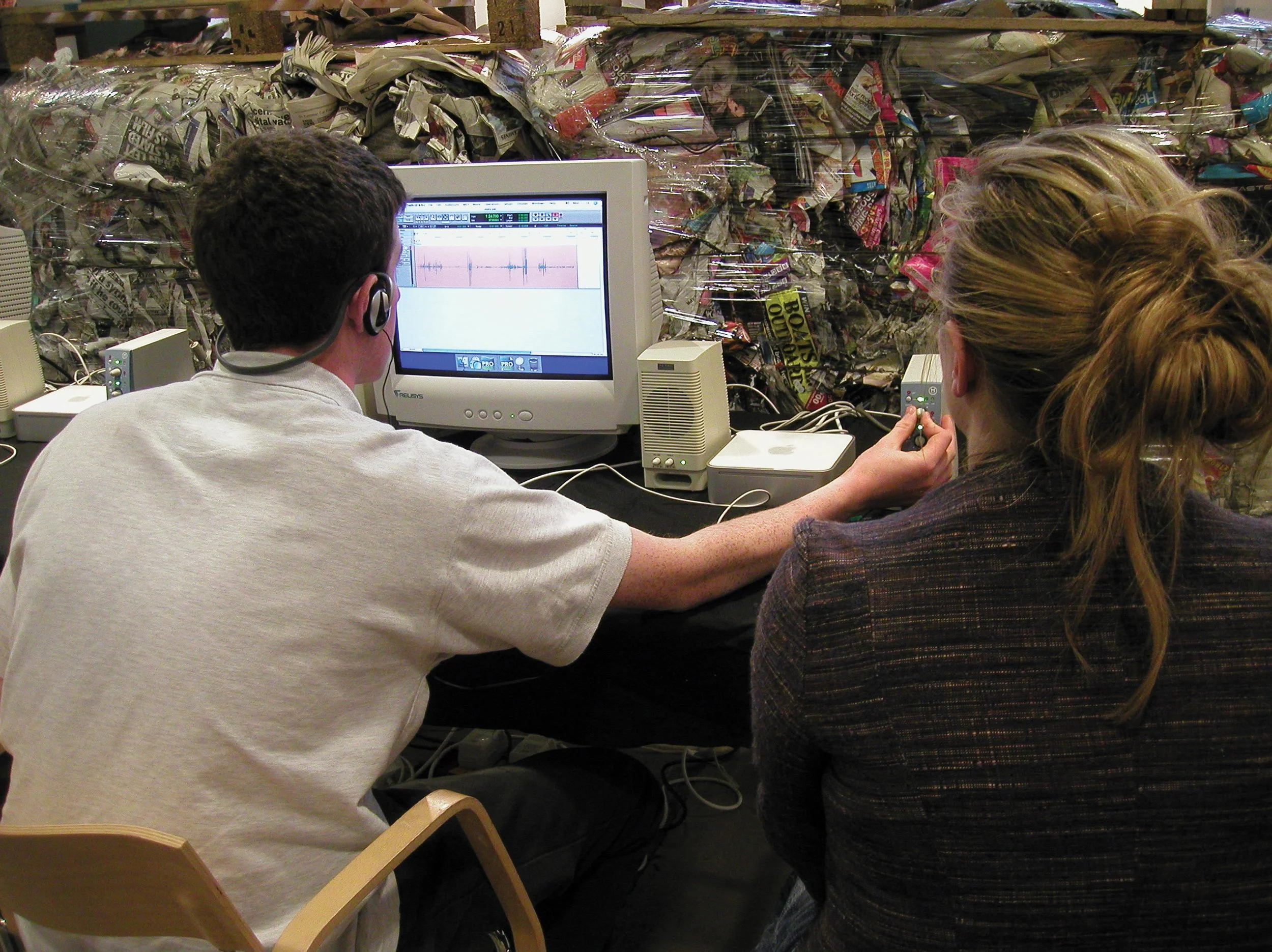 The second stage of the project deals with the manipulation of the recorded sounds to form the soundscape. The visitor is shown to a workstation in a separate area of the installation space The previously recorded files are present on this workstation and the participant, together with his/her helper manipulates the sound clips to produce a unique and personal soundscape. Other soundclips produced from previous visitors can also be incorporated in the piece thus re-enforcing the concept of ‘public’ being both a private and a collective creator.