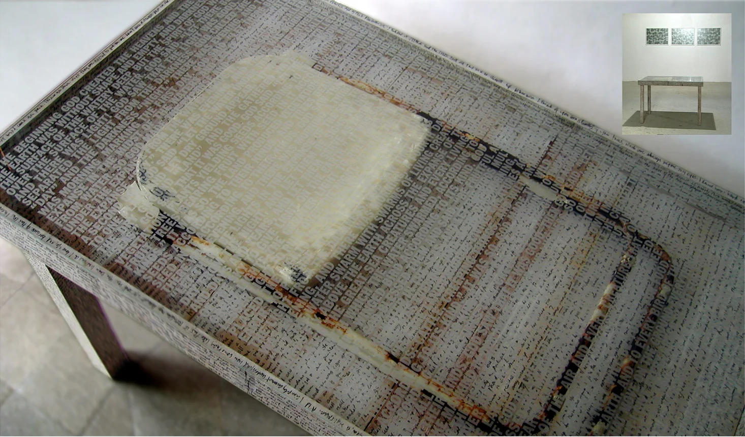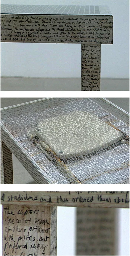 TABLE FOR CHAIR, wood, glass, metal, plastic, paint, vinyl lettering and handwritten text, 2002